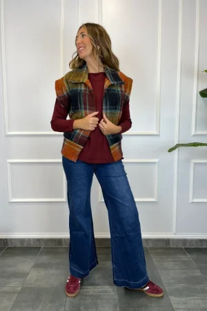 Chaleco estampado de cuadros grandes, con cuello camisero. Chaleco bierto, sin cierre.