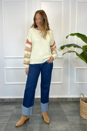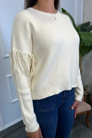 26,99 €Jersey de punto medio canalé con cuello caja y flecos en media manga.