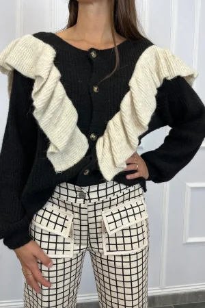 32,99 €Rebeca negra con volantes delanteros y traseros color marfil. Botones con diferente tonos de marrones.