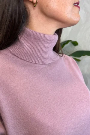 18,99 €Jersey de punto fino de color lila claro de manga larga y puños ajustados. Jersey de cuello cisne para mujer.